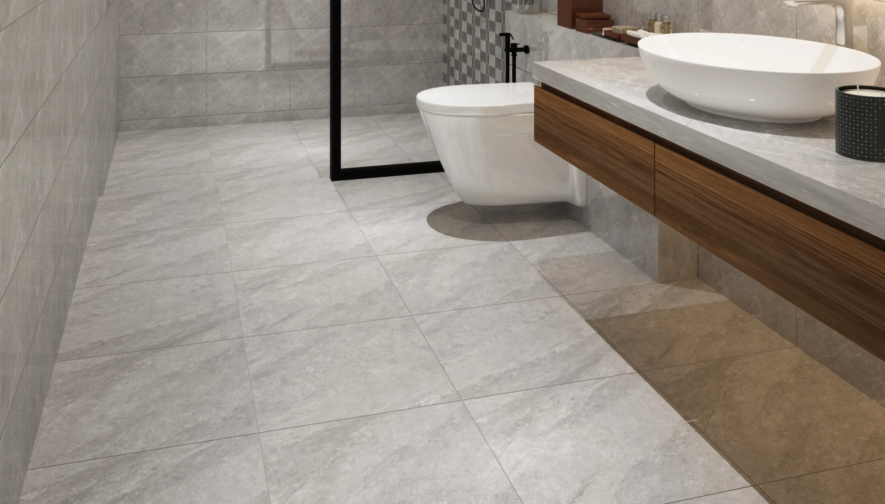 Larsen Grey tiles present a soft stone character with layered textures and gentle grey movement, creating a grounded and modern feel. Comes in SuperStop Series, more safe for your bathroom