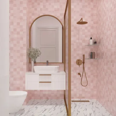 Faded embossed tiles with a glossy finish, featuring subtle square relief and trendy pastel colors. The soft texture adds depth and dimension, creating a fresh, modern look that feels playful yet refined for contemporary interiors.